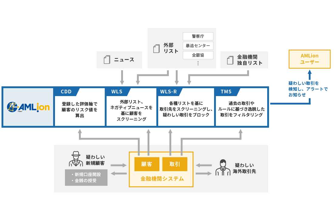 それらに取り組むためのアンチマネーロンダリングパッケージソフトとして「AMLion(アムリオン)」は、CDD(カスタマーデューディリジェンス)、WLS(ウォッチリストスクリーニング)、TMS(取引モニタリング サービス)というマネーロンダリング対策に必要な機能を一つの共通プラットフォーム上で提供し、厳格なKYCと適切なリスク検知を実現すると共に、検出されたリスクの対処をワークフロー管理で支援することによって、貴社のコンプライアンス業務を強力にサポートします。